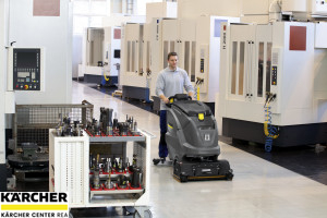 Podlahový mycí stroj s odsáváním (80 l) s pohonem pojezdu. Ideální pro plochy 1.500 - 3.000 m². Konfigurační příklad s kotoučovými kartáči se zametací funkcí a pracovní šířkou 75 cm.
