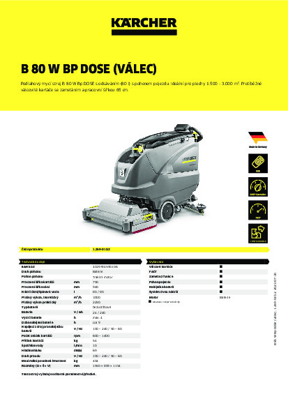 Podlahový mycí stroj B 80 W Bp DOSE s odsáváním (80 l) s pohonem pojezdu. Ideální pro plochy 1.500 - 3.000 m². Protiběžné válcovité kartáče se zametáním a pracovní šířkou 65 cm.