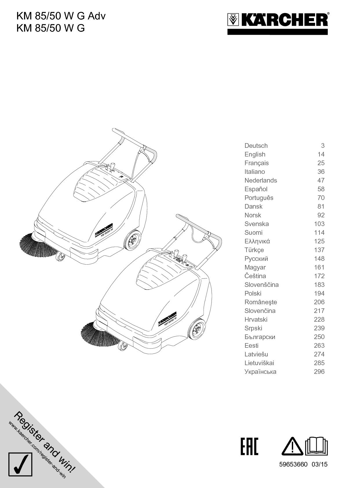 Zametací stroj s odsáváním Kärcher KM 85/50 W G Adv je ručně vedený, samopojízdný zametací stroj s benzinovým pohonem. Stroj pracuje na principu přehazování přes hlavu, přičemž lze zásobník na zametené nečistoty využít na 100 %. Velmi uživatelsky příjemný i díky nízké hmotnosti, malá hlučnost, dobrá obratnost i jízdní vlastnosti díky kompaktní konstrukci. Pohon: - Čtyřtaktní benzinový motor HONDA - Rychlost zametání cca 4,5 km/h (při jízdě vpřed) Systém zametání/sání: Osazení zametacího válce štětinami do tvaru V umožňuje dobrou přepravu nečistot a vede k optimálnímu výsledku zametání. Zásobník na zametené nečistoty: Pojízdný zásobník je vyrobený z nekorodujícího plastu odolného proti nárazu a lze ho snadno vyjmout ze stroje.