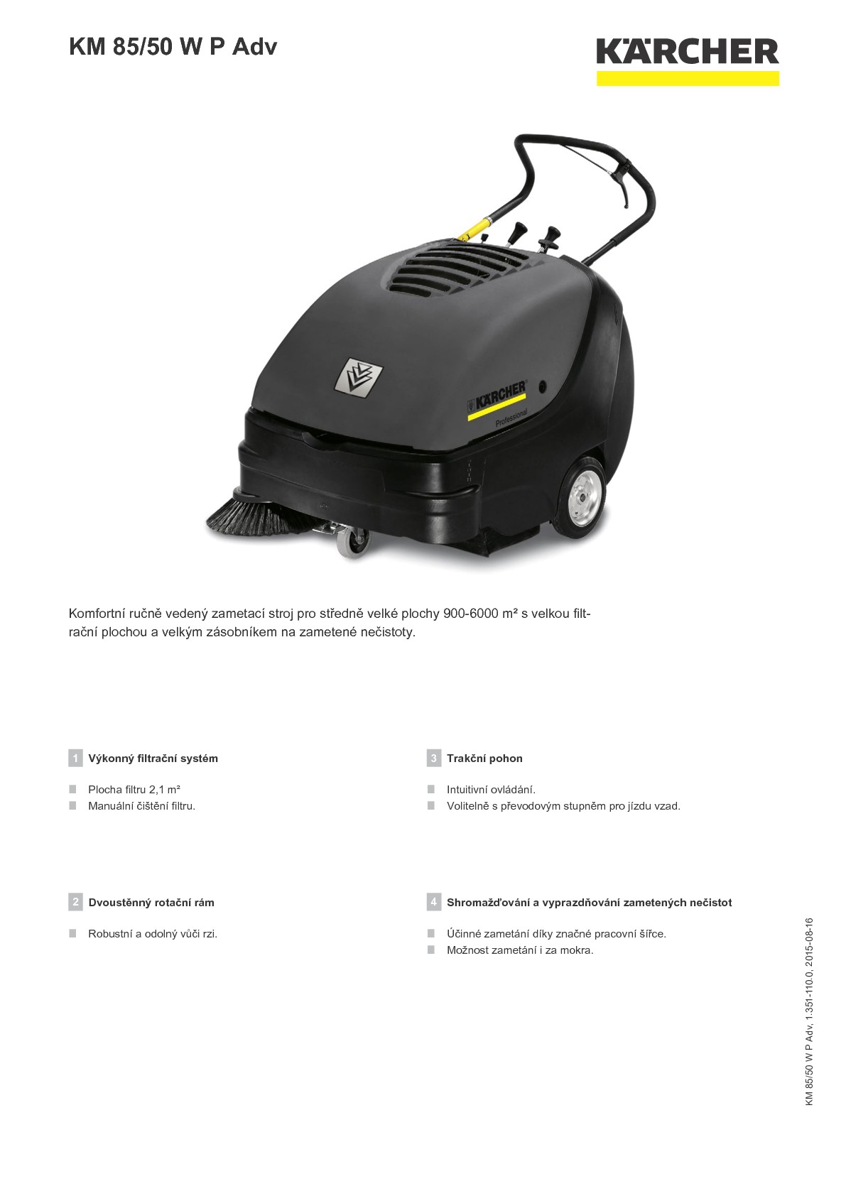 Komfortní ručně vedený zametací stroj pro středně velké plochy 900-6000 m² s velkou filtrační plochou a velkým zásobníkem na zametené nečistoty.