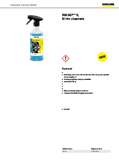 Kärcher odstraňovač hmyzu v nástřikové láhvi 500-ml odstraňuje hmyz jednoduše a šetrně z lakovaných a plastových povrchů, mřížek od chladiče, venkovních zrcátek a skel. Manuální nanášení. Čistič disků RM 667, 500 ml - S maximálním čistícím výkonem a rychlým působením proti všem nečistotám na všech běžných typech ráfků. Inteligentní změna barvy indikuje aktivní pracovní dobu čističe.