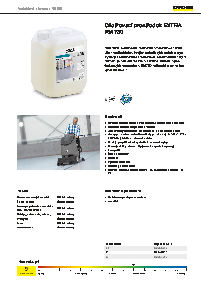 Silný čisticí a ošetřovací prostředek pro údržbové čištění všech voděodolných, tvrdých a elastických podlah a krytin. Vyvinutý speciálně také pro sportovní a multifunkční haly. K dispozici je posudek dle DIN V 18032-2:2001-04 o protiskluzových vlastnostech. Ošetřovací prostředek RM 780 málo pění a schne bez vytváření šmouh.