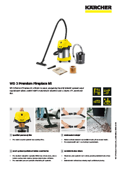 Přístroj WD 3 Premium Fireplace Kit základní třídy s přídavným filtrem na hrubé nečistoty a popel spolehlivě pojme vychladlý popel. Spotřeba proudu se pohybuje okolo 1000 Watt, přestože je vysavač stejně výkonný jako jiný obdobný přístroj se spotřebou 1400 Watt. Přístroj je vybaven robustní nádrží z nekorodující ušlechtilé oceli o objemu 17 l. K přístroji je dodáván i patronový filtr umožňující vysávání suchých a mokrých nečistot bez výměny filtru. Sací hadice a podlahová hubice na klipsy se 2 gumovými a 2 kartáčovými pásky byly optimalizovány pro lepší zachycení nečistot všeho druhu. Mimo to má přístroj odnímatelnou rukojeť, díky které lze namontovat příslušenství přímo na sací hadici. Díky praktické parkovací pozici lze sací trubku a podlahovou hubici při přerušení práce pohodlně zaparkovat. K tomu všemu se ještě přidává funkce fukaru, „Pull & Push“ uzavírací systém, ergonomicky tvarovaná rukojeť, praktická úschova kabelů a příslušenství.