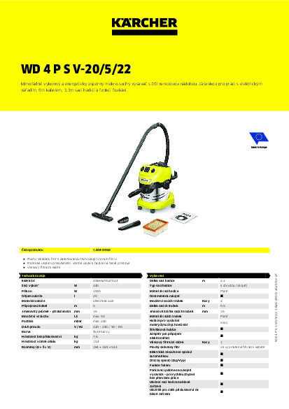 Mimořádně výkonný a energeticky úsporný vysavač s příkonem 1000 W: zařízení mokro-suchého vysavače WD 4 P S V-20/5/22, sací hadice a podlahová hubice s klipy jsou optimálně sladěny pro dosažení nejlepších výsledků úklidu. Mokré, suché, jemné nebo hrubé nečistoty jsou odstraňovány nepřetržitě bez výměny filtru. Přístroj se dodává s robustní a nárazuvzdornou 20litrovou nádobou z nerezové oceli, 5metrovým kabelem, 2,2metrovou sací hadicí, klipovou podlahovou hubicí, plochým skládaným filtrem a vliesovým filtračním sáčkem. Vestavěná elektrická zásuvka s automatickým vypínačem usnadňuje práci s elektrickým nářadím. Díky patentované technologii lze filtr ve vysavači na mokré a suché vysávání snadno a rychle vyjmout - aniž by přišel do styku s jakoukoli nečistotou. Tam, kde vysávání není možné, pomůže přídavná funkce foukání. Odnímatelná rukojeť umožňuje připojit příslušenství přímo k sací hadici. Hadici lze kompaktně uložit na hlavě přístroje. Trubky a podlahovou hubici lze také rychle a pohodlně zaparkovat na nárazníku. Mezi další výhody patří uzamykací systém "Pull & Push" pro snadné otevírání a zavírání nádoby a ergonomicky tvarovaná rukojeť pro pohodlné přenášení zařízení.