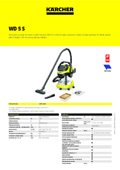 Víceúčelový vysavač WD 5 S V-25/5/22 disponuje sací hadicí a přepínatelnou podlahovou hubicí, které jsou optimálně sladěny. To znamená, že při spotřebě energie 1100 wattů dosahuje vysavač na mokré a suché vysávání optimálních výsledků čištění suchých, mokrých, jemných nebo hrubých nečistot. Zařízení je dodáváno s robustní nerezovou nádobou o objemu 25 litrů, 5metrovou šňůrou, 2,2 metru dlouhou sací hadicí s odnímatelnou, elektrostaticky chráněnou rukojetí, zapínatelnou podlahovou hubicí, plochým skládaným filtrem a fleecovým filtračním sáčkem. Plochý skládaný filtr je vhodný pro nepřetržité mokré i suché vysávání bez nutnosti výměny filtru. Díky patentované technologii vyjímání filtru lze plochý skládaný filtr vyjmout během několika sekund a přitom se vyhnout jakémukoli kontaktu s nečistotami. Pro účinné vyčištění filtru a obnovení sacího výkonu lze stisknout tlačítko čištění filtru. Odnímatelná rukojeť umožňuje připojení příslušenství přímo k sací hadici. Hadici lze bezpečně zajistit na hlavě zařízení pro úsporu místa. Parkovací poloha na nárazníku umožňuje rychlé a pohodlné uložení trubic a podlahové hubice při krátké přestávce v práci.