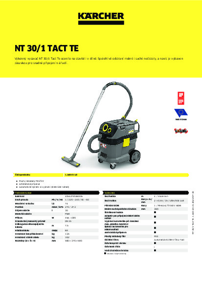 Každodenní, tvrdé pracovní nasazení na stavbách a v dílnách klade vysoké nároky na řemeslníky a vybavení. Náš vysavač pro vysávání mokrých a suchých nečistot NT 30/1 Tact Te skvěle dostojí těmto požadavkům. Kompaktní expert na vysávání jemného prachu garantuje svojí stabilní 30 l nádobou s robustními kovovými koly a nárazníkem, výklopným systémem a osvědčeným systémem čištění filtru Tact vysávání velkého množství prachu bez přerušení za nejtěžších podmínek. Plochý skládaný PES filtr odolný proti vlhkosti přispívá právě tak k bezprašnému pracovnímu prostředí. Řemeslníci i ostatní uživatelé si cení jednoduché obsluhy a volby programu pomocí nově vyvinutého otočného přepínače a plynulé regulace počtu otáček. Stroj je kompletně vybavený nově vyvinutým a výrazně vylepšeným příslušenstvím, které lze pohodlně uložit přímo na stroji. Zásuvka pro připojení nářadí se spínací a vypínací automatikouusnadňuje práci s elektrickým nářadím.