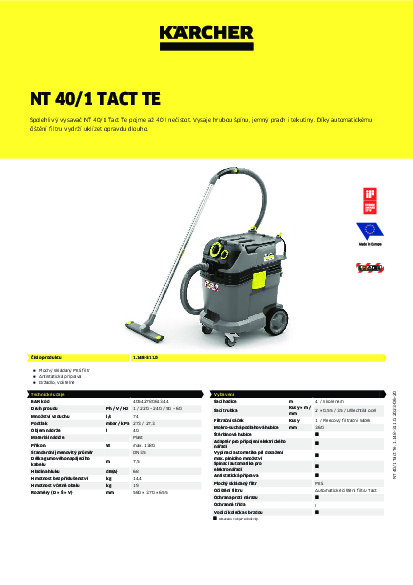 DomůVysavačePro mokro-suché vysáváníKärcher mokro-suchý vysavač NT 40/1 Tact Te L
