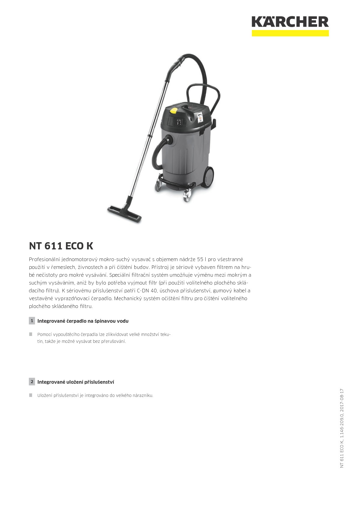 Mokro-suchý vysavač NT 611 Eco K je obzvláště uživatelsky přátelský přístroj, vhodný pro univerzální použití v řemeslech a živnostech. Přístroj je schopen přes čerpadlo odstranit velké množství nasátých tekutin, takže lze vysávat kontinuálně. Elektronická kontrola stavu naplnění automaticky při dosažení maximální hladiny kapaliny vypíná turbínu. Se dvěma velkými koly vzadu a oběma vodicími kolečky vpředu je tento robustní přístroj zabezpečený proti převrácení a je velmi pohyblivý. Vzhledem ke své nízké hmotnosti je snadno přenositelný. Komfort nabízí také velký spínač /vypínač a úschova kabelu a příslušenství přímo na přístroji. Velmi praktický je plochý skládaný filtr (volitelný), jež s sebou přináší mnoho výhod: Uživatel může bez dlouhého přerušení střídavě vysávat jak mokré, tak suché nečistoty, neboť filtrační vložka (volitelný plochý skládaný filtr) leží vždy nad hladinou kapaliny.Filtr je snadno a rychle dosažitelný, aniž by musela být sejmuta hlava turbíny. Plochý skládaný filtr zvyšuje užitný objem nádrže vysavače, neboť do něj nezasahuje.