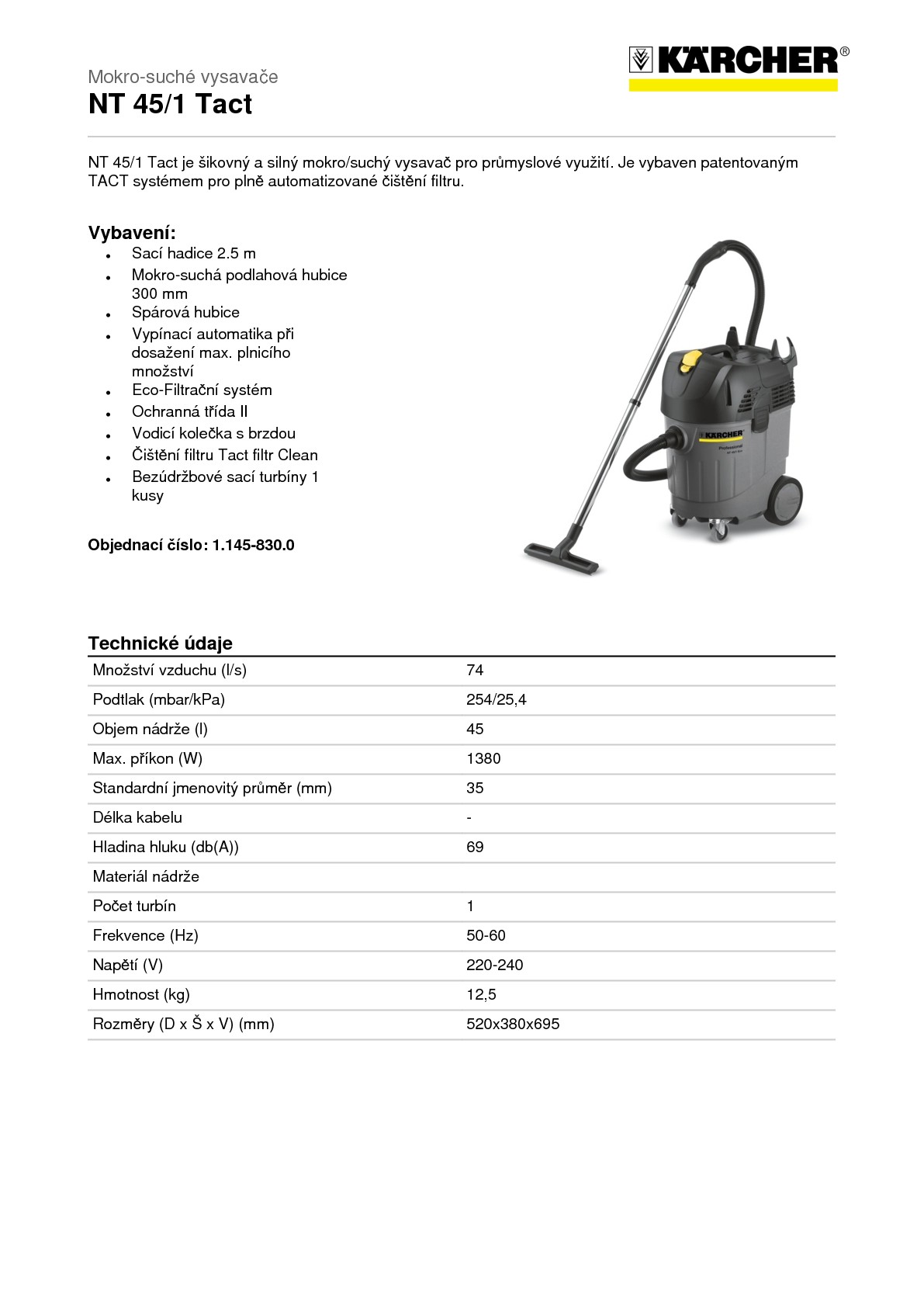 Průmyslový vysavač Kärcher NT 45/1 Tact je určený na vysávání suchých i mokrých nečistot a je snadno obsluhovatelný a vhodný pro univerzální použití. Je schopen vysát prach, suché nečistoty a kapaliny. Disponuje robustní nárazu vzdornou plastovou nádobou o velikosti 45 l s dlouhou životností a o nízké hmotnosti pro bezproblémové přenášení. Je vybaven velmi praktickým plochým skládaný filtrem, který zvyšuje užitný objem nádoby na nečistotu, protože do ní nezasahuje a plně automatickým čištěním filtru, které umožňuje vysávání velkého množství prachu bez přerušení práce s konstantě vysokým sacím výkonem.