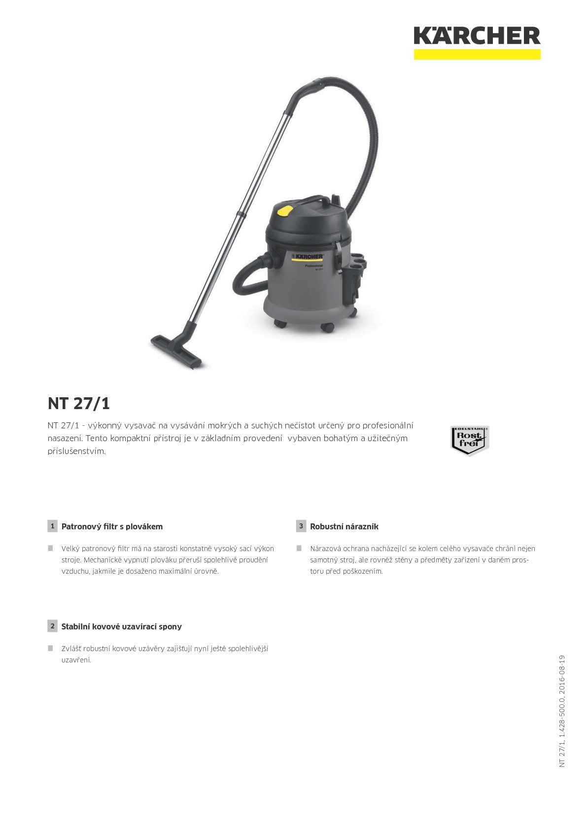 Kärcher NT 27/1 je kompaktní, obratný a obzvláště uživatelsky přívětivý mokro-suchý vysavač pro univerzální profesionální použití. Vysoký sací výkon vysavače NT 27/1 lze odvodit od vysoce výkonné sací turbíny. Vysavač je vybaven filtrační patronou. Mechanická ochrana před přeplněním s plovákovým systémem garantuje spolehlivé vypnutí přístroje při nasávání tekutin, aby tak zabránila překročení maximálního povoleného množství. Stará se tak o delší životnost a práci bez únavy. Praktický Clip-systém pro rychlou výměnu, popř. připojení příslušenství umožňuje snadnou manipulaci. Pět řídících koleček zajišťuje lehký doběh, obratnost a bezpečníé stání stroje. Kromě toho je NT 27/1 vybavený praktickou odkládací plochou na hlavě ventilátoru, který je, stejně jako plášť vysavače, vyroben z nárazuvzdorného plastu. Další předností vysavače NT 27/1 je držák příslušenství a hák na zavěšení kabelu na stroji. Ergonomické držadlo s uložením sací trubky zaručuje snadnou a pohodlnou přepravu stroje společně s příslušenstvím. Nárazová ochrana nacházející se kolem celého stroje chrání nejen samotný vysavač, ale rovněž stěny, stroje a předměty zařízení v daném prostoru před poškozením.