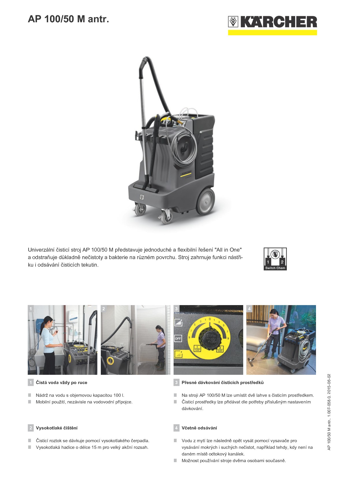 Univerzální čisticí stroj AP 100/50 M představuje jednoduché a flexibilní řešení "All in One" a odstraňuje důkladně nečistoty a bakterie na různém povrchu. Stroj zahrnuje funkci nástřiku i odsávání čisticích tekutin.