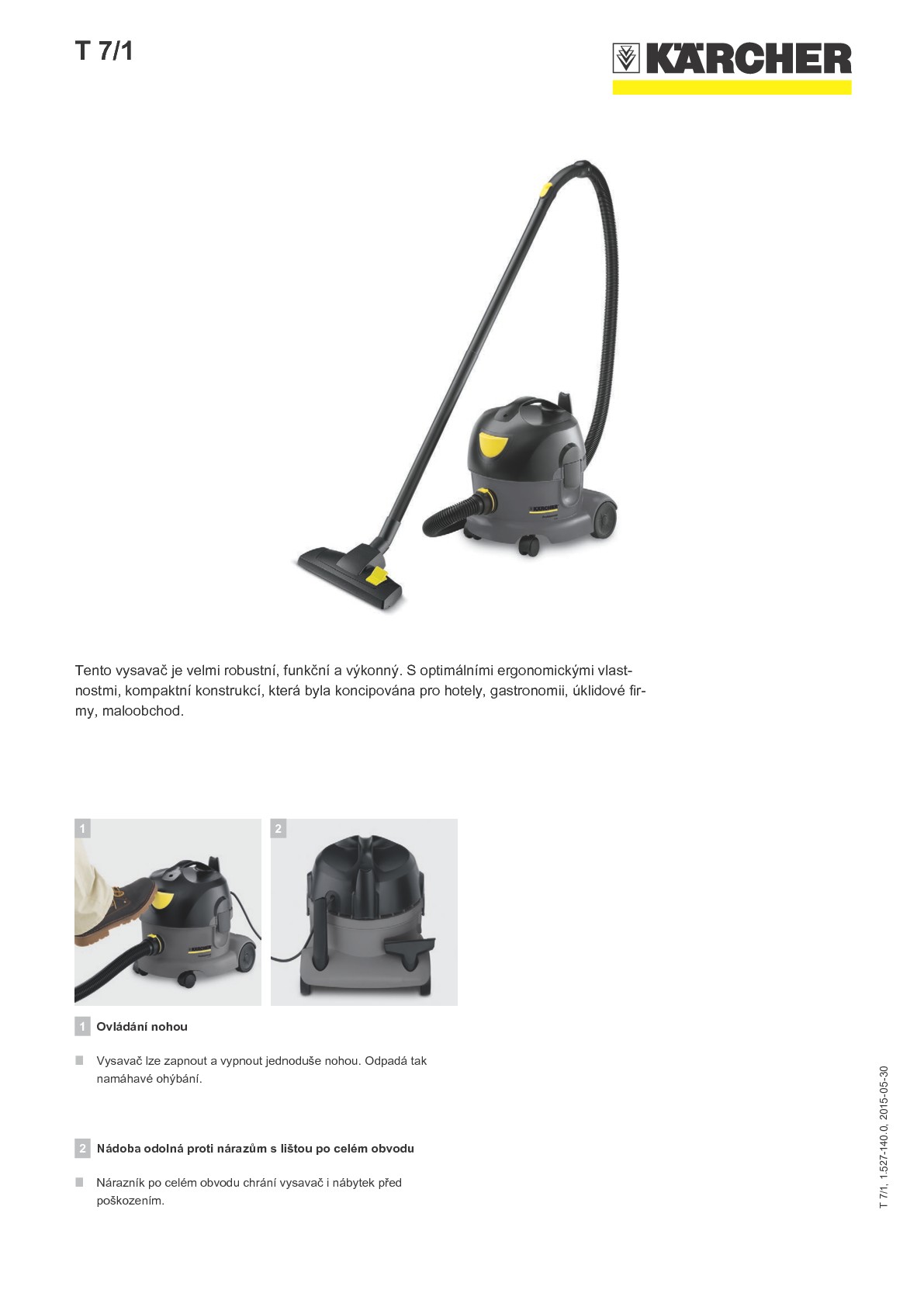 Příkonem 1.200 W vyrábí tento kompaktní vysavač Kärcher silný podtlak o hodnotě 24,5 kPa. Přístroj lze jednoduše a pohodlně bez zatěžujícího ohýbání vypínat a zapínat pomocí nožního spínače. Ergonomicky tvarované koleno s plynulou regulací sání dovoluje dlouhé pracovní intervaly bez únavy. Délka sací hadice je 2.0 m. Vysavač je vybaven dvěma bočními koly a dvěma vodicími kolečky pro lepší pojíždění. Nárazník po obvodu vysavače se stará o to, aby nárazuvzdorná nádrž o kapacitě 7l nezpůsobila žádné škody na nábytku. Sériově je Kärcher T 7/1 vybaven vliesovým filtračním sáčkem, který je schopný pojmout až dvakrát více prachu v porovnání s papírovým filtračním sáčkem.