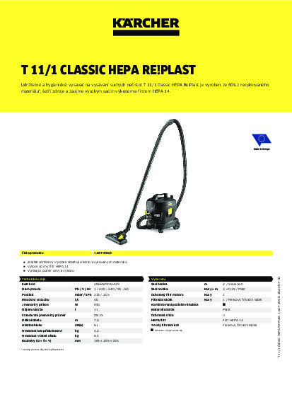 Suchý vysavač Kärcher T 11/1 Classic HEPA Re!Plast