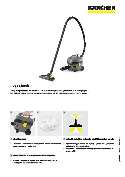 S výkonem 850 W vytváří kompaktně sestavený vysavač Kärcher T 7/1 Classic na suché nečistoty silné vakuum o 23,0 kPa. Přitom pracuje s pouhými 63 dB(A) příjemně tiše. Přístroj disponuje dvoumetrovou sací hadicí a se svou hmotností 3,5 kg je velmi lehký. Prakticky tvarované koleno s plynulou regulací sací síly umožňuje trvalou, neúnavnou práci. Díky dvěma bočním a dvěma vodicím kolečům vysavač lépe popojíždí. Nárazník po obvodu vysavače zajišťuje to, aby nárazuvzdorná nádrž o objemu 7,5 litru nezpůsobila škody na nábytku atd. Vysavač T 7/1 Classic je vyráběn sériově a je vybaven vliesovým filtračním sáčkem.