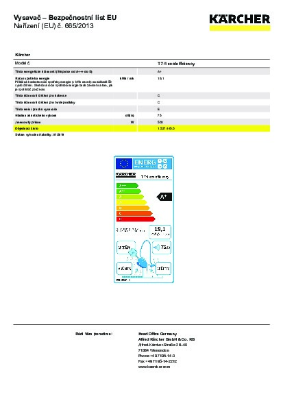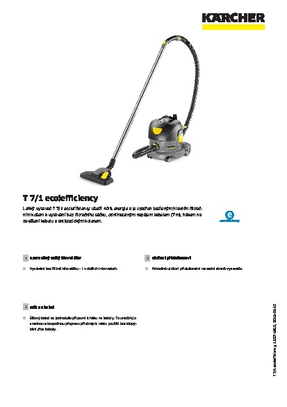 Oproti standardním vysavačům dosáhnete s tímto extra lehkým a kompaktním vysavačem na suché nečistoty - Kärcher T 7/1 eco!efficiency - až 40% úspory energie. Zesílený stálý hlavní filtr umožňuje vysávání i bez filtračního sáčku. Zasunovací napájecí kabel o délce 7 m umožňuje rychlou výměnu kabelu. Hák na zavěšení kabelu, který je umístěn na hlavě vysavače, zajišťuje rychlou a bezpečnou úschovu kabelu. Antistatické koleno výrazně snižuje elektrostatické výboje.