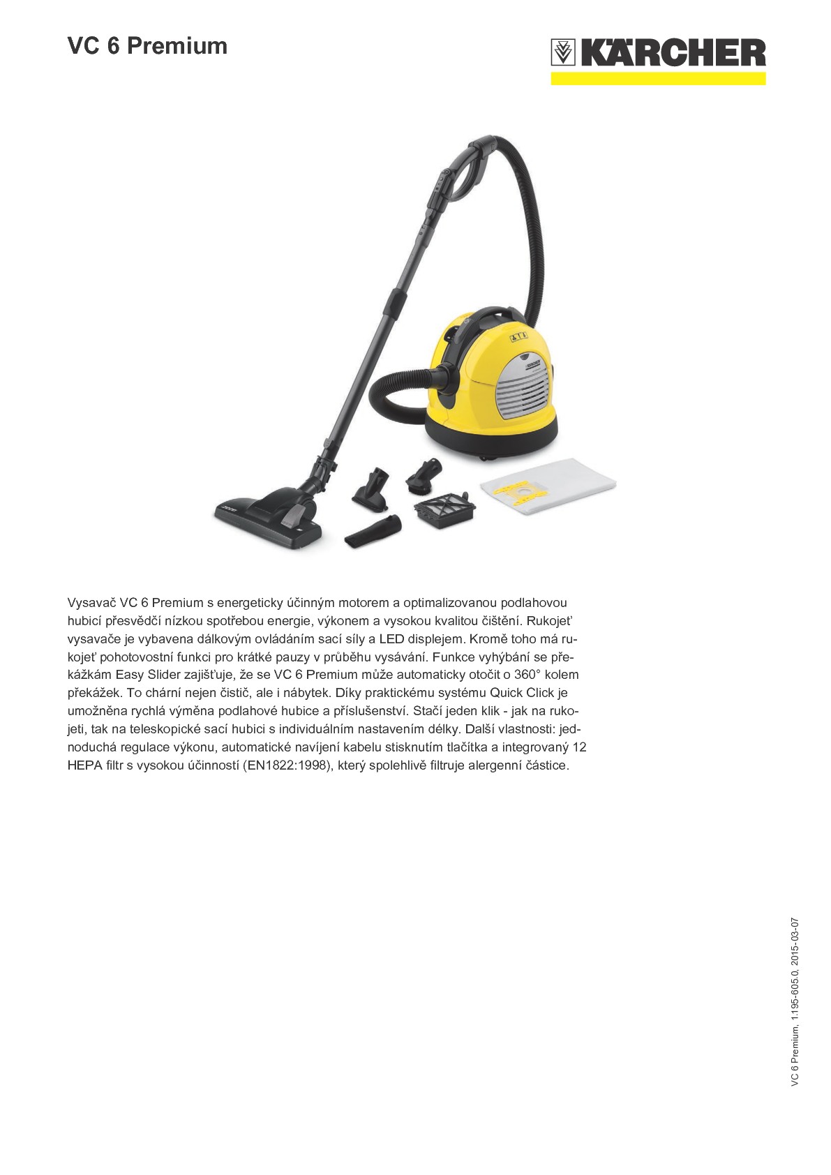 Vysavač VC 6 Premium s energeticky účinným motorem a optimalizovanou podlahovou hubicí přesvědčí nízkou spotřebou energie, výkonem a vysokou kvalitou čištění. Rukojeť vysavače je vybavena dálkovým ovládáním sací síly a LED displejem. Kromě toho má rukojeť pohotovostní funkci pro krátké pauzy v průběhu vysávání. Funkce vyhýbání se překážkám Easy Slider zajišťuje, že se VC 6 Premium může automaticky otočit o 360° kolem překážek. To chární nejen čistič, ale i nábytek. Díky praktickému systému Quick Click je umožněna rychlá výměna podlahové hubice a příslušenství. Stačí jeden klik - jak na rukojeti, tak na teleskopické sací hubici s individuálním nastavením délky. Další vlastnosti: jednoduchá regulace výkonu, automatické navíjení kabelu stisknutím tlačítka a integrovaný 12 HEPA filtr s vysokou účinností (EN1822:1998), který spolehlivě filtruje alergenní částice.