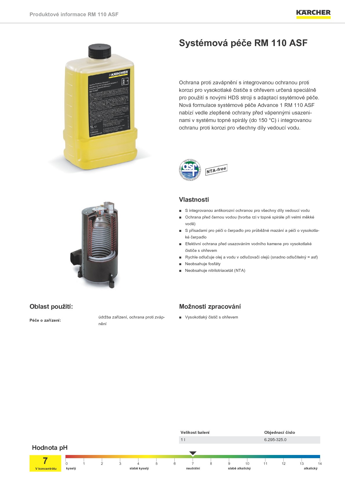 Ochrana proti zavápnění s integrovanou ochranou proti korozi pro vysokotlaké čističe s ohřevem určená speciálně pro použití s novými HDS stroji s adaptací sytémové péče. Nová formulace systémové péče Advance 1 RM 110 ASF nabízí vedle zlepšené ochrany před vápennými usazeninami v systému topné spirály (do 150 °C) i integrovanou ochranu proti korozi pro všechny díly vedoucí vodu.