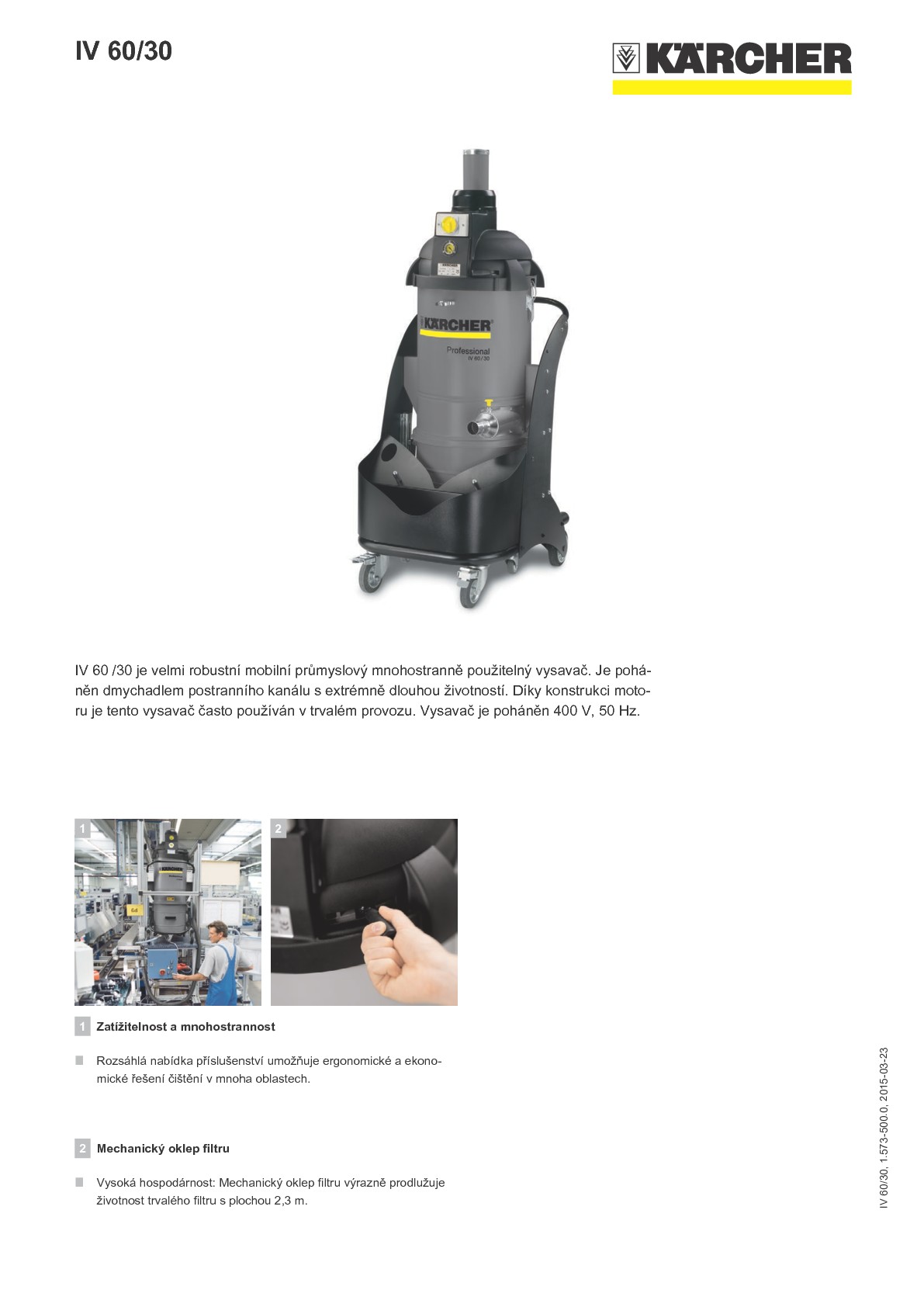 IV 60 /30 je velmi robustní mobilní průmyslový mnohostranně použitelný vysavač. Díky jeho konstrukci a množství průmyslového příslušenství ho lze použít pro mnoho úkolů z oblasti čištění. Jeho dmychadlo postranního kanálu se stará o velmi vysoký sací výkon. Díky stavbě motoru se tento stroj používá často v trvalém provozu. Použité dmychadlo postranního kanálu vykazuje velmi dlouhou životnost. Podmíněně své konstrukci a velikosti, lze tento stroj používat i mobilně, tzn. použít na více místech v podniku. Pokud musí být vysavač při práci odstaven na nějaké stoupání, postarají se dvě kolečka opatřená brzdou o bezpečné stání. Vyjímatelná nádoba na nečistoty s kolečky umožňuje jednoduchý odvoz vysátých nečistot. Zabudovaný cyklonový odlučovač odloučí největší množství prachu již při vstupu do vysavače a tím prodlužuje výrazně životnost filtrů. Filtr s velkou filtrační plochou a vysokým výkonem zachycení (prověřeno pro M) se postará o dlouhé pracovní intervaly bez přerušení. Držák příslušenství na přední straně stroje umožňuje velmi komfortní uložení kompletního sacího příslušenství. V dodatečně zabudované přihrádce lze uložit malé díly příslušenství nebo nářadí. Na zabudovaný hák na kabel lze zavěsit elektrokabel při přepravě nebo zbytek kabelu při práci. Manuální, externí očištění filtru zajistí dlouhé pracovní intervaly a dlouhou životnost filtru.řená brzdou o bezpečné stání. Vyjímatelná nádoba na nečistoty s kolečky umožňuje jednoduchý odvoz vysátých nečistot. Zabudovaný cyklonový odlučovač odloučí největší množství prachu již při vstupu do vysavače a tím prodlužuje výrazně životnost filtrů. Filtr s velkou filtrační plochou a vysokým výkonem zachycení (prověřeno pro M) se postará o dlouhé pracovní intervaly bez přerušení. Držák příslušenství na přední straně stroje umožňuje velmi komfortní uložení kompletního sacího příslušenství. V dodatečně zabudované přihrádce lze uložit malé díly příslušenství nebo nářadí. Na zabudovaný hák na kabel lze zavěsit elektrokabel při přepravě nebo zbytek kabelu při práci. Manuální, externí očištění filtru zajistí dlouhé pracovní intervaly a dlouhou životnost filtru.