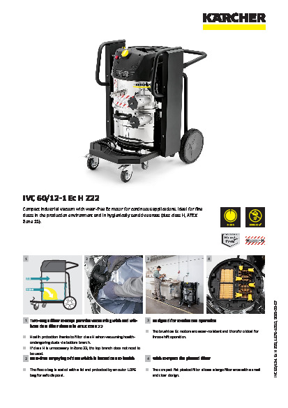 Kompaktní průmyslový vysavač IVC 60/12-1 Ec H Z22 je jako stvořený pro čištění ve výrobních prostorách a výrobních strojů. Díky svému neopotřebitelnému kompresoru bočního kanálu je přístroj vhodný pro kontinuální použití a tím je ideální jako stacionární sací zařízení u výrobních a balicích strojů. Manuální čištění filtru mnohokrát prodlužuje životnost filtru. Průmyslové vysavače kompaktní třídy s certifikací ATEX jsou schválené pro použití v zóně 22 oblastí s nebezpečím výbuchu. Díky inovativní technologii motoru jsou tyto stroje ideální pro trvalé používání.