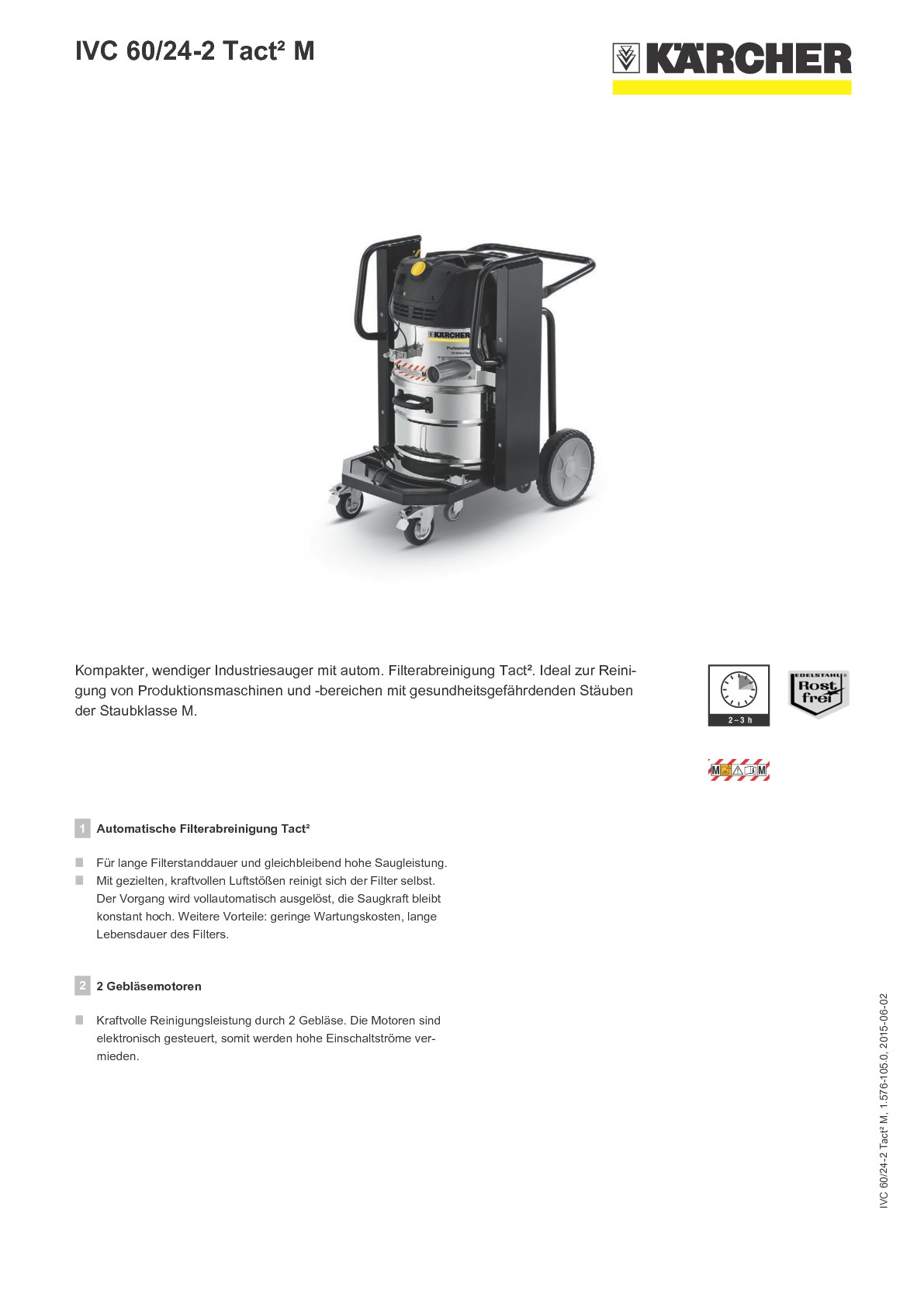 Kompaktní průmyslový vysavač IVC 60/24-2 Tact² se nejlépe hodí k čištění výrobních prostor a výrobních strojů. Přístroj je díky vybavení velkými koly a brzdovými kolečky snadno pohyblivý a vhodný nejlépe pro mobilní použití. Kromě toho je vysavač certifikovaný pro třídu prachu M Automatické čištění filtru TACT² zaručuje dlouhou dobu provozu bez přerušení.