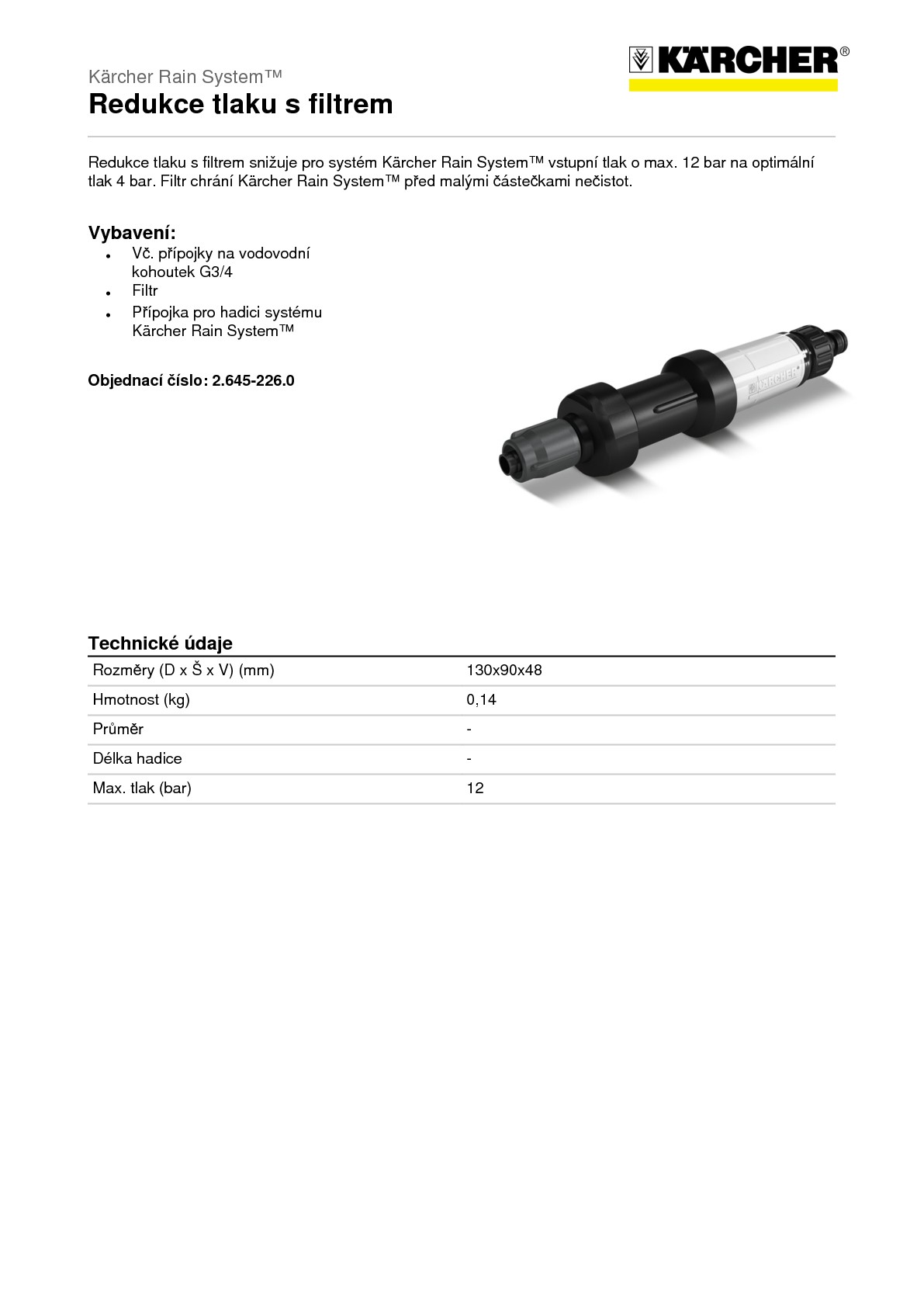 Redukce tlaku s filtrem je částí systému Kärcher Rain System™. Snižuje vstupní tlak z max. 12 bar na výstupní tlak 4 bar. Redukce tlaku je umístěna mezi přívodní hadicí a systémem Kärcher Rain System™. Filtr chrání systém před malými částečkami nečistot. Filtrační vložku lze snadno vyjmout a vyčistit. Na vstupní straně se nachází přípojka k vodovodnímu kohoutku, která je kompatibilní se všemi známými západkovými systémy. Na výstupní straně lze připojit hadici nebo hadici pro kapénkovou závlahu systému Kärcher Rain System™. Hadice se snadno přímo nasadí a bez pomoci nářadí upevní převlečnou maticí. Efektivní zavlažovací systém Kärcher Rain System™ spojuje výhody mikroodkapávání a běžného zavlažování. Systém pracuje pod tlakem až 4 bar a lze jej přizpůsobit téměř jakémukoliv typu zahrady. Spolu se SensoTimerem, kterým se nastaví zavlažování podle potřeby, funguje perfektně.