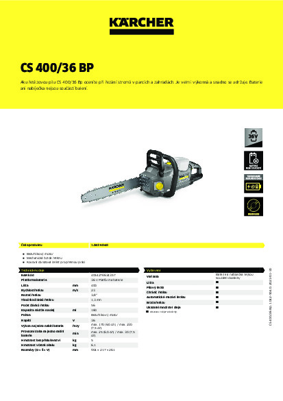 AKU řetězová pila CS 400/36 Bp je vhodná pro každodenní údržbu domu, zahradnické práce, odstranění škod způsobených bouří, drobné lesnické práce nebo práce na vylepšování parků a městských oblastí. Robustní AKU řetězová pila Kärcher je dokonale vyvážená a velmi dobře padne do ruky díky kvalitně promyšlené ergonomii. Pila zároveň tlumí vibrace, je méně hlučná a nemá žádné výfukové plyny. Výhodou jsou i nízké náklady na povoz a údržbu. Baterie a nabíječka nejsou součástí balení a je třeba je dokoupit.