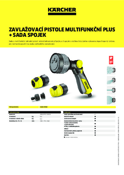 Sada pro mnohé úkoly zavlažování. Sada multifunkčních postřikovacích pistolí se přizpůsobí nejrůznějším požadavkům rozdílných rostlin. Multifunkční postřikovací pistole modelu Plus (obj. č.: 2.645-269.0) zavlažuje, aniž by někde odkapávala voda, a nabízí 4 obrysy postřiku: sprchu, bodový a plochý paprsek a jemné mlžení. Zdolá tak nejen zavlažování, ale i jednoduchý úklid. Otočná rukojeť s aretovatelným spouštěčem může být nastavena dopředu či dozadu a poskytuje tak individuální uživatelský komfort - tak typický pro výrobky společnosti Kärcher. Sada obsahuje ještě 2 vysoce kvalitní univerzální hadicové spojky Plus s vložkou Grip - jedna je včetně Aqua Stopu - a přípojku ke kohoutu G3/4" s redukcí G1/2". Při odpojování postřikovače nedochází díky praktickému Aqua Stopu k průtoku vody, i když je přitom vodovodní kohoutek povolen. Spojky jsou navíc univerzální pro všechny běžně dostupné průměry zahradních hadic. Ostatně: Postřikovače a spojky od společnosti Kärcher jsou kompatibilní se všemi dostupnými zacvakávacími systémy a k Vaší zahradní hadici je snadno připojíte.