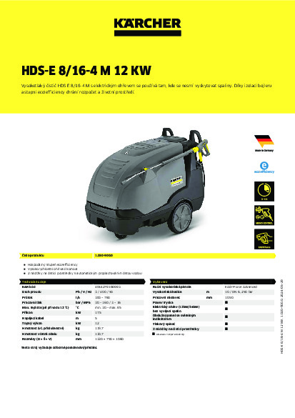 Inovativní vysokotlaký čistič s ohřevem HDS E 8/16-4M Vás přesvědčí vynikající efektivitou spotřeby energie a mimořádně vysokou pracovní teplotou. Díky moderní, vysoce účinné izolaci bojleru ze speciálního pěnového materiálu výrazně klesla spotřeba elektrické energie v trvalém provozu Stand-by. Tak lze ušetřit až 40 % energie. Režim eco!effiency přepne zařízení automaticky do mimořádně efektivního 60° C provozu a ušetří tím cenné zdroje. Vysoká pracovní teplota maximálně 85° C je zvlášť výhodná u mastných a olejových nečistot, přičemž díky funkci Servo Control lze udržet teplotu v trvalém provozu až na 80 ° C. Komora s rychlým ohřevem umožňuje výrazně zkrátit dobu předohřevu. Vysokotlaký čistič s ohřevem se používá tam, kde se nesmí vyskytovat spaliny nebo kde jsou dokonce zakázané, např. v potravinářství, nemocnicích, vývařovnách nebo průmyslových provozech.ozu až na 80 ° C. Komora s rychlým ohřevem umožňuje výrazně zkrátit dobu předohřevu. Vysokotlaký čistič s ohřevem se používá tam, kde se nesmí vyskytovat spaliny nebo kde jsou dokonce zakázané, např. v potravinářství, nemocnicích, vývařovnách nebo průmyslových provozech.
