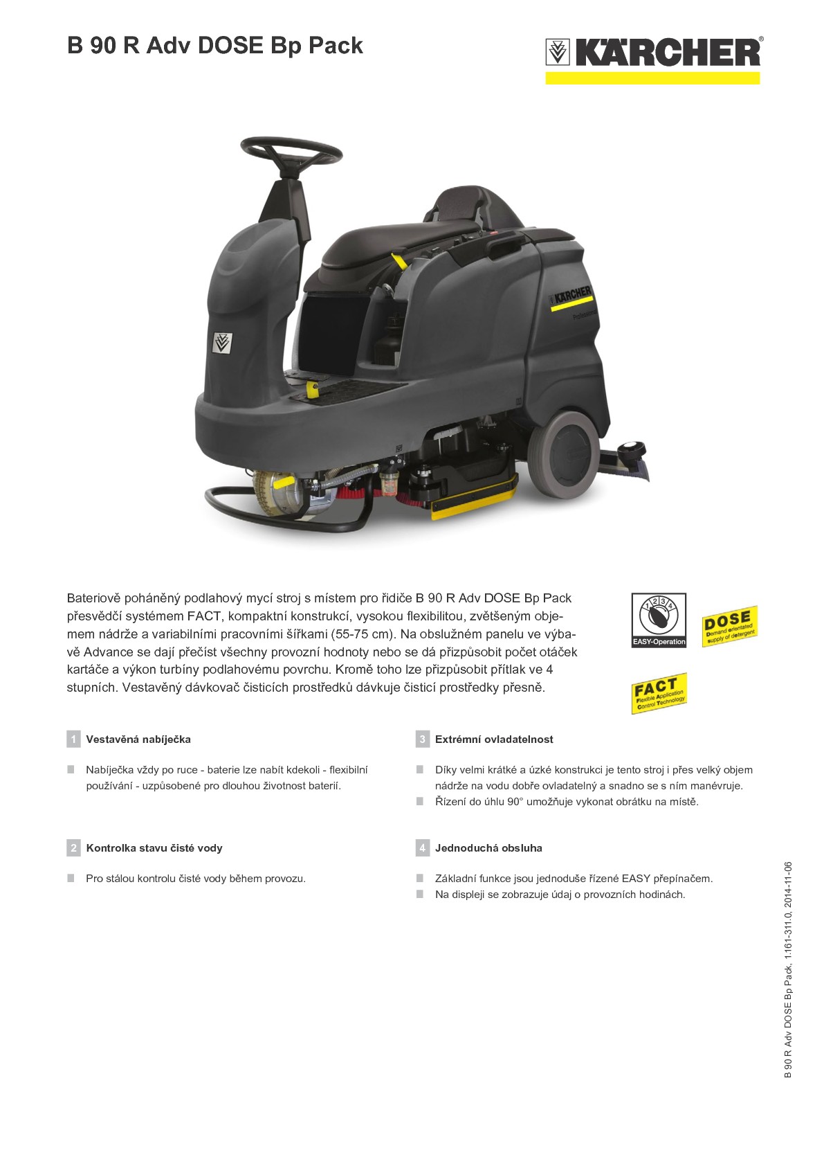 Podlahový mycí stroj s odsáváním a místem pro řidiče B 90 R Adv DOSE Bp Pack s bezúdržbovou baterií a vestavěnou nabíječkou je vybavený dávkovacím systémem DOSE a umožňuje hospodárné nakládání s čisticími prostředky. Dávkování čisticích prostředků lze uzpůsobit podle stupně znečištění. Přidávání probíhá s přesností mezi 0,5 a 3 % (v krocích 0,5 %). Mimoto je k dispozici systém Flexible Application Control Technology (FACT) pro správné nastavení otáček kartáčů podle potřeby. Stroj nové generace kartáčové hlavy dovoluje používání hlav válcových, resp. kotoučových kartáčů v různých pracovních šířkách (55, 65 a 75 cm) pro maximální flexibilitu, přičemž pohon kartáče zajišťuje hvězdicový unašeč. Poloměrem otáčení jen 1,6 m je dána velká obratnost stroje, díky čemuž se s ním snadno manévruje. Navíc stroj disponuje větším objemem nádrže, kterou lze snadno naplnit čistou vodou. Kompaktní rozměry umožňují bezproblémové uložení, nakládku i přepravu. O ochranu turbíny před korozí se stará doplňkový plochý skládaný filtr. Stručně řečeno: Obratná alternativa ke každému velkému stroji Walk behind!