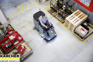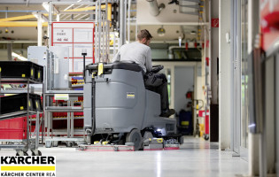 Ideální na členité plochy: podlahový mycí stroj s odsáváním a posedem B 110 R. S kotoučovými kartáči s pracovní šířkou 75 centimetrů, integrovanou nabíječkou a kapacitou nádrže 110 litrů.