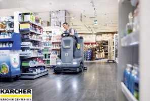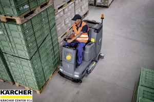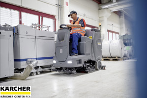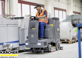 Ideální pro středně velké plochy, bateriově poháněný a tichý podlahový mycí stroj s posedem, 110litrovou nádrží a vysoce výkonnou kartáčovou hlavou a sací lištou.