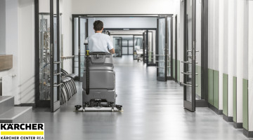 Plošný výkon až 2000 m2 za hodinu: bateriový podlahový mycí stroj s odsáváním BD 50/70 R Classic s kotoučovým kartáčem. Baterie a nabíječku je třeba objednat zvlášť.