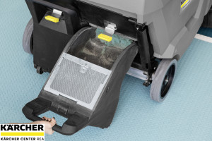 - Výkonný filtrační systém - Plochý skládaný filtr z polyesteru. Efektivní očišťování duálními stěrkami pohodlně z místa obsluhy. Přístup k filtru bez použití nářadí díky doširoka otevíracímu krytu stroje.