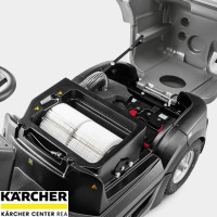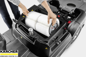 - Velká plocha filtru s automatickým čištěním - Po každé odstávce stroje dochází k automatickému očištění filtru – pro stále bezprašné zametání a dlouhé pracovní intervaly. Očištění filtru lze aktivovat i manuálně. Výměna filtru bez použití nářadí.
