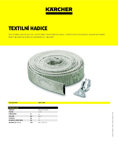 Sada se skládá z flexibilní 1 1/4" ploché hadice a hadicové spony z ušlechtilé oceli (30–40 mm) s křídlovým šroubem pro připojení bez nářadí. Sada textilních hadic Kärcher je zvlášť vhodná pro používání s ponornými čerpadly na čistou a špinavou vodu. Představuje ideální řešení pro čerpání velkého množství vody jako například při záplavách. Hadici o délce 10 metrů lze namotat naplocho a tím ji skladovat bez velkých nároků na místo. Maximální provozní tlak činí 5 bar.