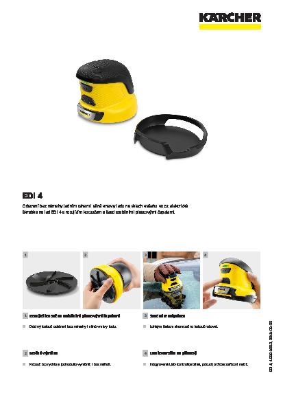 Elektrická škrabka na led EDI 4 konečně zatočí s namáhavým škrabáním kousek za kouskem. Pomocí rotujícího kotouče se šesti plastovými čepelemi odstraní bateriová škrabka bez námahy jedním tahem i odolnější vrstvy ledu na sklech vašeho vozu. Pokud je EDI 4 zapnutý v pohotovostním provozu, postačí lehký tlak shora, aby se kotouč začal točit – a hned se led uvolňuje prakticky sám od sebe. Pokud by někdy došlo k opotřebení čepelí, vyměníte kotouč snadno bez použití nářadí (kotouč dodáváme jako náhradní díl). Moderní a kompaktní design elektrické škrabky a ochranného krytu umožňují jednoduchou a bezpečnou manipulaci a uložení. Jedno nabití baterie postačí pro několik použití. Vestavěná LED kontrolka bliká, pokud je třeba zařízení nabít.