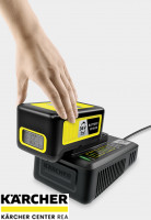Sada pro všechna zařízení bateriové platformy Kärcher 36 V: Starter Kit Kärcher Battery Power 36/25, obsahující vyměnitelnou baterii 36 V / 2,5 Ah Kärcher Battery Power s inovativní Real Time Technology a dále 36V rychlonabíječku, která nabije baterii za pouhých 48 minut až na 80 procent.