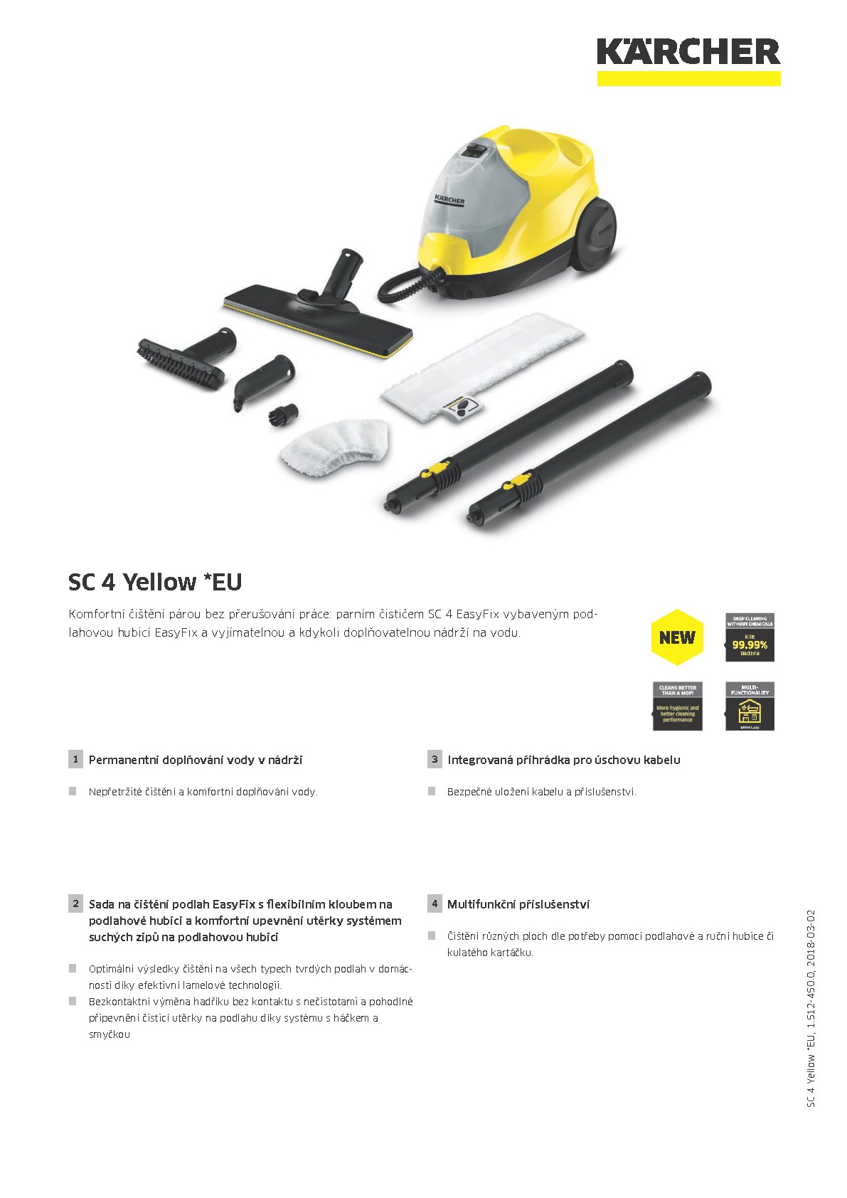 - Permanentní doplňování vody v nádrži - Nepřetržité čištění a komfortní doplňování vody. Parní čistič SC 4 Yellow *EU: Sada na čištění podlah EasyFix s flexibilním kloubem na podlahové hubici a komfortní upevnění utěrky systémem suchých zipů na podlahovou hubici