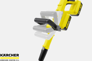 - 18 V Kärcher Battery Power bateriová platforma - Technologie reálného času s LCD displejem baterie: zobrazuje zbývající dobu provozu, zbývající dobu nabíjení a kapacitu baterie. Dvě vyměnitelné baterie lze použít se všemi ostatními zařízeními 18 V platformy Kärcher Battery Power.