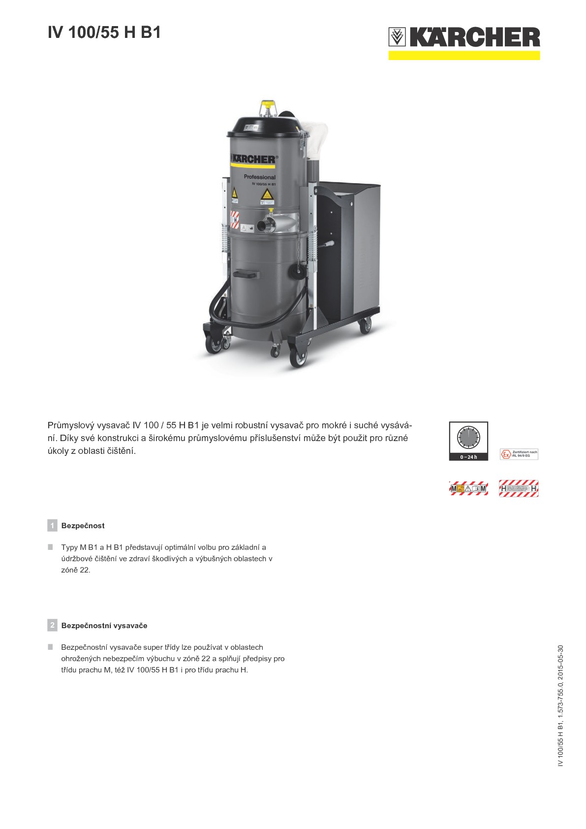 Průmyslový vysavač IV 100/55 H B1 je velmi robustní, speciálně vyvinutý pro výbušné prachy tříd St 1, St 2 a St 3 v zóně 22. Na rovné ploše jím může dobře manipulovat i jedna osoba. Průmyslový vysavač se však prodává převážně pro jedno pracoviště s jedním nebo více místy sání a zůstává ve většině případů po delší dobu na jednom místě. Díky své konstrukci a množství průmyslového příslušenství ho lze použít pro mnoho úkolů z oblasti čištění. Jeho dmychadlo postranního kanálu, chráněné bezpečnostním ventilem proti přehřátí motoru, se postará o vysoký sací výkon. Vyjímatelná nádoba na nečistoty skolečky umožňuje jednoduchý odvoz vysátých nečistot. Zabudovaný cyklonový odlučovač odloučí největší množství prachu již při vstupu do vysavače a tím prodlužuje výrazně životnost filtrů. Filtr s velkou filtrační plochou a vysokým výkonem zachycení (prověřeno pro M s doplňkovým H filtrem) se postará odlouhé pracovní intervaly bez přerušení. V odkládací přihrádce nad motory lze uložit malé díly příslušenství nebo nářadí. Manuální, externí čištění filtru zajistí dlouhé pracovní intervaly a dlouhou životnost filtru.