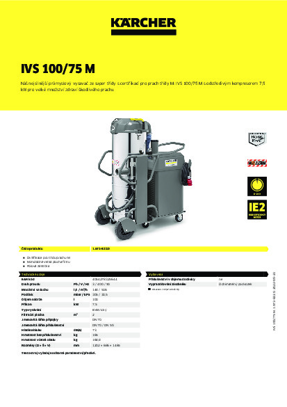 IVS 100/75 M je top model super třídy průmyslových vysavačů s certifikací pro prach třídy M. Díky extrémně výkonným komponentám, jako kompresor s bočním kanálem, vysává také velká množství zdraví škodlivého jemného prachu. Největší trojfázový motor této třídy pracuje velmi efektivně (IE2) s pozvolným rozběhem, který účinně zabraňuje spínacímu přepětí. Kromě toho byl vysavač vyvinutý pro mobilní a stacionární trvalé nasazení a vybavený nádobou o objemu 100 litrů z ušlechtilé oceli a spouštěcím mechanismem i velkým růžicovým filtrem se 16 sklady. Čištění filtračního systému probíhá manuálním, horizontálním oklepáváním filtru. Speciální převodovka pro cílený přenos síly přitom zajišťuje kdykoli a nezávisle na vložené síle uživatele srovnatelné výsledky čištění. Příslušenství lze při přepravě bezpečně uložit na vysavači, zatímco volitelné dálkové ovládání smysluplně doplňuje vybavení IVS 100/75 M.