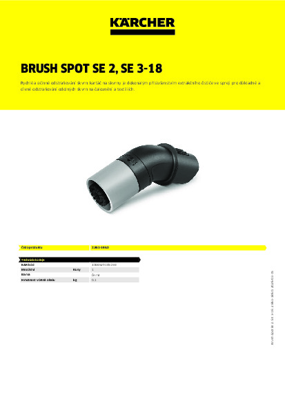 Kartáč na skvrny je dokonalým řešením pro hloubkové čištění a rychlé a důkladné odstranění skvrn na textiliích a lze jej použít s extrakčními čističi SE 2 Spot a SE 3-18 Compact s rozprašovačem. Osvědčená technologie extrakce rozprašováním Kärcher s automatickým vysáváním vody během čištění umožňuje čisté odstranění skvrn bez kapek a zanechává v textiliích jen málo vlhkosti. Spotovací kartáč má také působivou funkci systémového čištění, která zabraňuje znečištění kartáče během čištění.