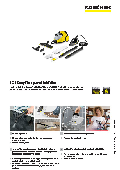 Parní čistič Kärcher SC 5 EasyFix s parní žehličkou je velkým pomocníkem pro každou domácnost. S tlakem páry 4,2 bar je nejsilnějším parním čističem ve svém třídě. A parní žehlička potěší úsporou času v žehlení až o 50 %. Pára s vysokou účinností zabíjí i KORONAVIRY* a BAKTERIE** a vyčistí všechny tvrdé povrchy v domácnosti. Funkce VapoHydro nechá zmizet i velmi zatvrdlé nečistoty. Dále nabízí regulaci páry, práci bez přerušování (kdykoliv doplnitelná nádrž na vodu), úložný prostor pro kabel a příslušenství či parkovací polohu pro flexibilní podlahovou hubici - ta umožňuje bezkontaktní manipulaci s utěrkou na podlahy. * Testy ukázaly, že při bodovém čištění po dobu 30 sekund při max. výkonu páry lze s parním čističem Kärcher odstranit 99,999 % obalených virů, jako je koronavirus nebo chřipka (s výjimkou viru hepatitidy B) na běžných hladkých tvrdých površích v domácnostech (testovaný zárodek: virus vakcínie Ankara). ** Při důkladném čištění s parním čističem Kärcher bude 99,99 % všech běžných domácích bakterií zničeno na standardních hladkých tvrdých površích v domácnostech, pokud bude rychlost čištění 30 cm/s při použití max. výkonu páry (testovaný zárodek: Enterococcus hirae).