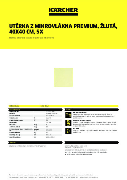 Žlutá utěrka Premium z mikrovlákna od společnosti Kärcher je vlasově pletený, objemný čisticí hadřík z mikrovlákna určený pro stříkání a vlhké čištění. Díky své obzvláště jemné struktuře pronikají vlákna této opakovaně použitelné textilie hlouběji do čištěných povrchů, než je to možné u konvenčních vláken, a zachycuje prach, odolnou špínu a bakterie rychleji a důkladněji. Díky tomu je utěrka obzvláště vhodna pro použití v oblastech, kde mají velký význam objemy sběru nečistot a schopnost absorbovat nečistoty, jako je zdravotnictví nebo hotelnictví a stravování. Kromě žluté je k dispozici také v zelené, červené a modré, v souladu s obvyklým barevným kódováním používaným profesionály v oblasti čištění pro různé oblasti použití. K čištění lze utěrku použít suchý nebo předem navlhčený, ale je také možné nastříkat čisticí prostředek přímo na suchý nebo navlhčený hadřík.