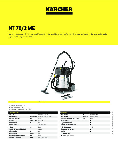 Průmyslový vysavač Kärcher NT 70/2 Me je profesionální, robustní, dvoumotorový stroj na vysávání mokrých a suchých nečistot a kapalin s objemem nádoby na nečistoty 70 l. Disponuje vysokým sacím výkonem sací turbíny o napájecím napětí 230 V.