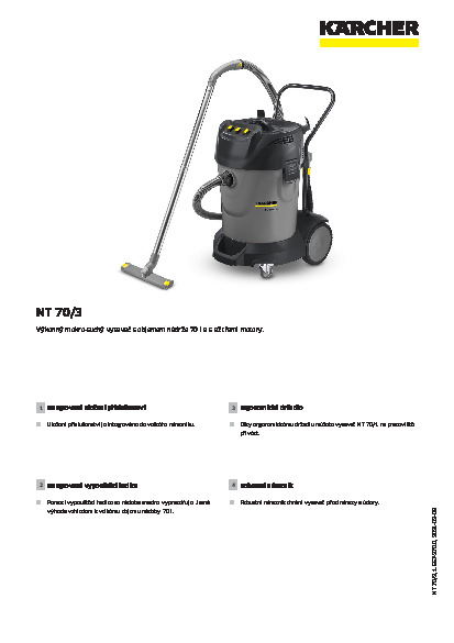 Průmyslový vysavač Kärcher NT 70/3 je profesionální, robustní, třímotorový stroj na vysávání mokrých a suchých nečistot a kapalin s objemem nádoby na nečistoty 70 l. Disponuje vysokým sacím výkonem sací turbíny o napájecím napětí 230 V.