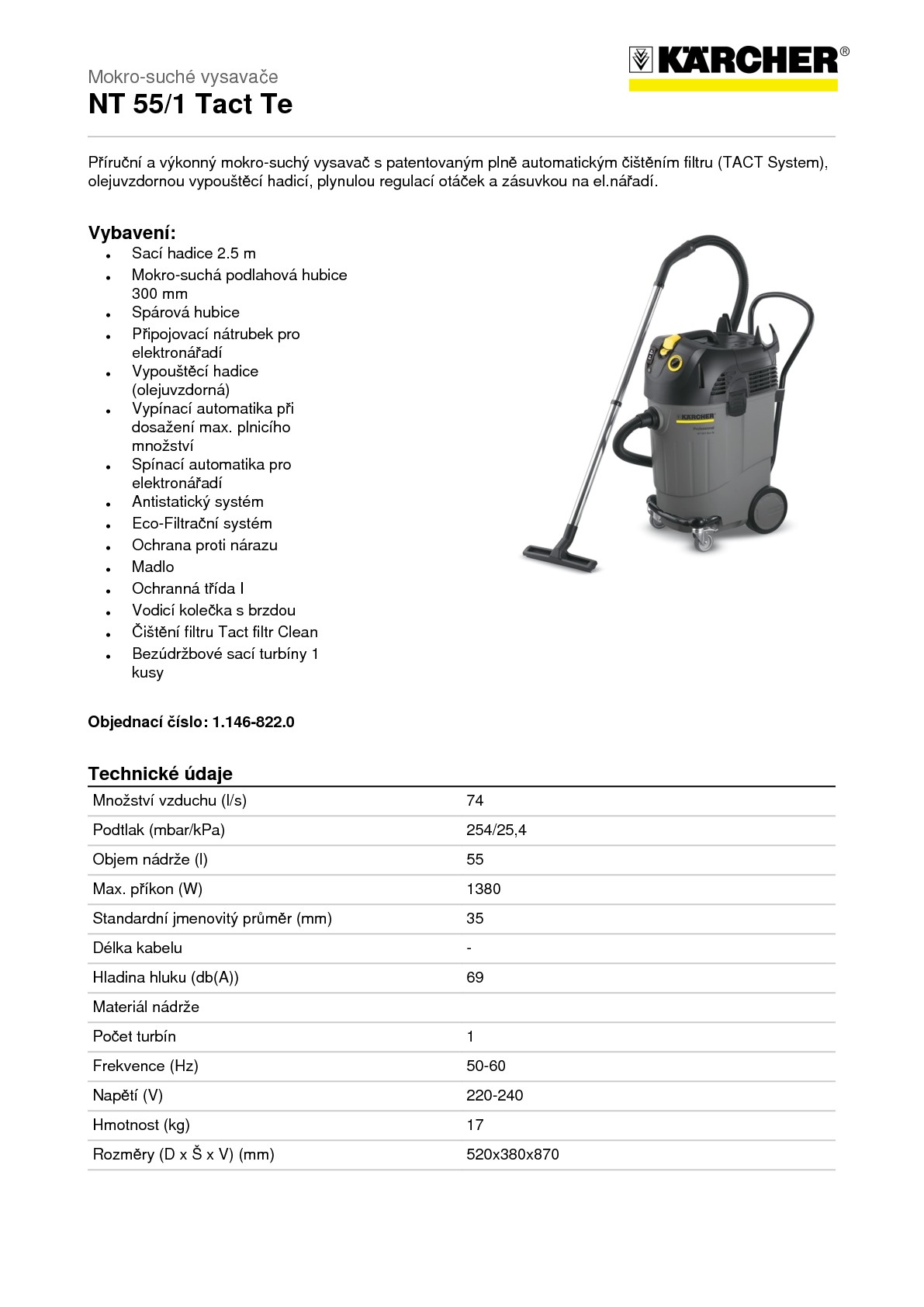 Průmyslový vysavač Kärcher NT 55/1 Tact je určený na vysávání suchých i mokrých nečistot a je snadno obsluhovatelný a vhodný pro univerzální použití. Je schopen vysát prach, suché nečistoty a kapaliny.