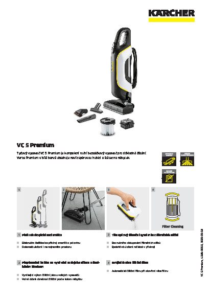 Mimořádný vysavač VC 5 Premium firmy Kärcher dokazuje, že silný vysavač nemusí být velký. Kompaktní přístroj vyniká i přes své malé rozměry jedinečným vybavením a dokáže bez problémů udržet krok s velkými vysavači. Díky patentovanému trojitému teleskopickému systému lze vysavač o polovinu zmenšit. Jednoduše stisknete tlačítko, posunete a hned je vysavač jedním z nejkompaktnějších na světě a lze ho uložit i v nejmenší domácnosti. Za svůj výkon vděčí VC 5 Premium přepínatelné hubici Kärcher pro vysávání suchých nečistot s flexibilním kloubem. Hubice byla vyvinuta speciálně pro tento vysavač, vystačí si s nízkou spotřebou elektrické energie a vynaloží díky své konstrukci a speciální geometrii maximální sílu. A etiketa ErP je pro vysavač VC 5 Premium potvrzením těch nejlepších výsledků čištění na veškerých tvrdých podlahách a kobercích. Další inovací je filtrační systém bez sáčků s integrovaným čištěním filtru, které šetří drahé náhradní filtrační sáčky. Filtrační kazetu lze snadno vyjmout a filtr rychle vyprázdnit. Vysavač VC 5 Premium je skutečným silným trpaslíkem s velkým performance.