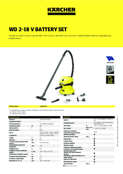 Bateriový vysavač na mokré a suché vysávání WD 2-18 je součástí 18 V bateriové platformy Kärcher Battery Power a nabízí maximální flexibilitu, kompaktní design a svobodu pohybu. Přístroj dokonale kombinuje 1,8 metru dlouhou sací hadici a klipsy podlahové hubice a dokáže během okamžiku odstranit mokré, jemné i hrubé nečistoty. Zařízení je také vybaveno robustní a nárazuvzdornou plastovou nádobou o objemu 12 litrů a také fleecovým filtračním sáčkem. Skladování sací hadice šetří místo; jednoduše jej zavěste na hlavu zařízení. Mezi další funkce patří praktická funkce fukaru pro oblasti, kde není možné vysávání, odkládací prostor na nářadí a drobnosti, otočný spínač pro snadné zapnutí a vypnutí přístroje, ergonomicky tvarované madlo pro přenášení a také "Pull & Push" uzamykací systém, který umožňuje snadné otevírání a zavírání nádoby. Parkovací poloha na nárazníku umožňuje rychlé a pohodlné uložení trubic a podlahové hubice při krátké přestávce při práci. Baterie a nabíječka jsou součástí balení.