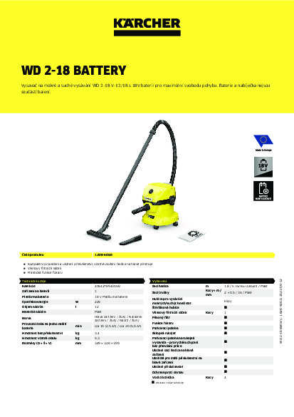 Bateriový vysavač na mokré a suché vysávání WD 2-18 je součástí 18 V bateriové platformy Kärcher Battery Power a nabízí maximální flexibilitu, kompaktní design a svobodu pohybu. Přístroj dokonale kombinuje 1,8 metru dlouhou sací hadici a klipsy podlahové hubice a dokáže během okamžiku odstranit mokré, jemné i hrubé nečistoty. Zařízení je také vybaveno robustní a nárazuvzdornou plastovou nádobou o objemu 12 litrů a také fleecovým filtračním sáčkem. Skladování sací hadice šetří místo; jednoduše jej zavěste na hlavu zařízení. Mezi další funkce patří praktická funkce fukaru pro oblasti, kde není možné vysávání, odkládací prostor na nářadí a drobnosti, otočný spínač pro snadné zapnutí a vypnutí přístroje, ergonomicky tvarované madlo pro přenášení a také "Pull & Push" uzamykací systém, který umožňuje snadné otevírání a zavírání nádoby. Parkovací poloha na nárazníku umožňuje rychlé a pohodlné uložení trubic a podlahové hubice při krátké přestávce při práci. Baterie a nabíječka nejsou součástí balení.
